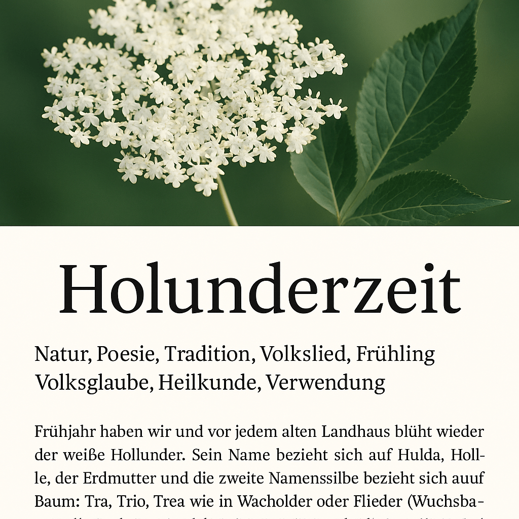 Lesedauer 2 MinutenHolunderzeit Vorwort Wenn im Frühling der Holunder in weißer Blüte steht, umweht uns mehr als nur süßer Duft. In seinem Schatten leben alte Mythen, Volkslieder und Heiltraditionen fort. Dieses Gedicht von W. Franzon spiegelt nicht nur die Poesie der Holunderzeit, sondern auch die sinnliche Kraft, die dieser „Baum der Frau