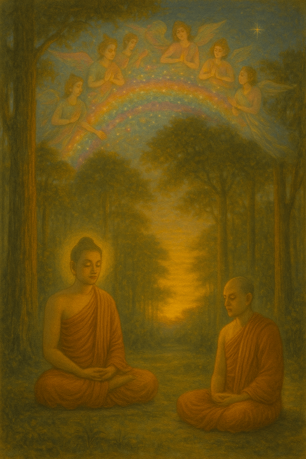 Lesedauer 3 MinutenLobpreis auf Sariputta Vorwort Diese Episode aus der buddhistischen Überlieferung verbindet Respekt, spirituelle Erkenntnis und transzendente Schönheit. Sie würdigt den ehrwürdigen Sariputta, einen der Hauptschüler des Buddha, und zeigt, wie selbst die himmlischen Wesen (Devaputtas) auf seine Weisheit blicken – mit Lob, Freude und ekstatischer Erscheinung. Diese Szene lädt zum